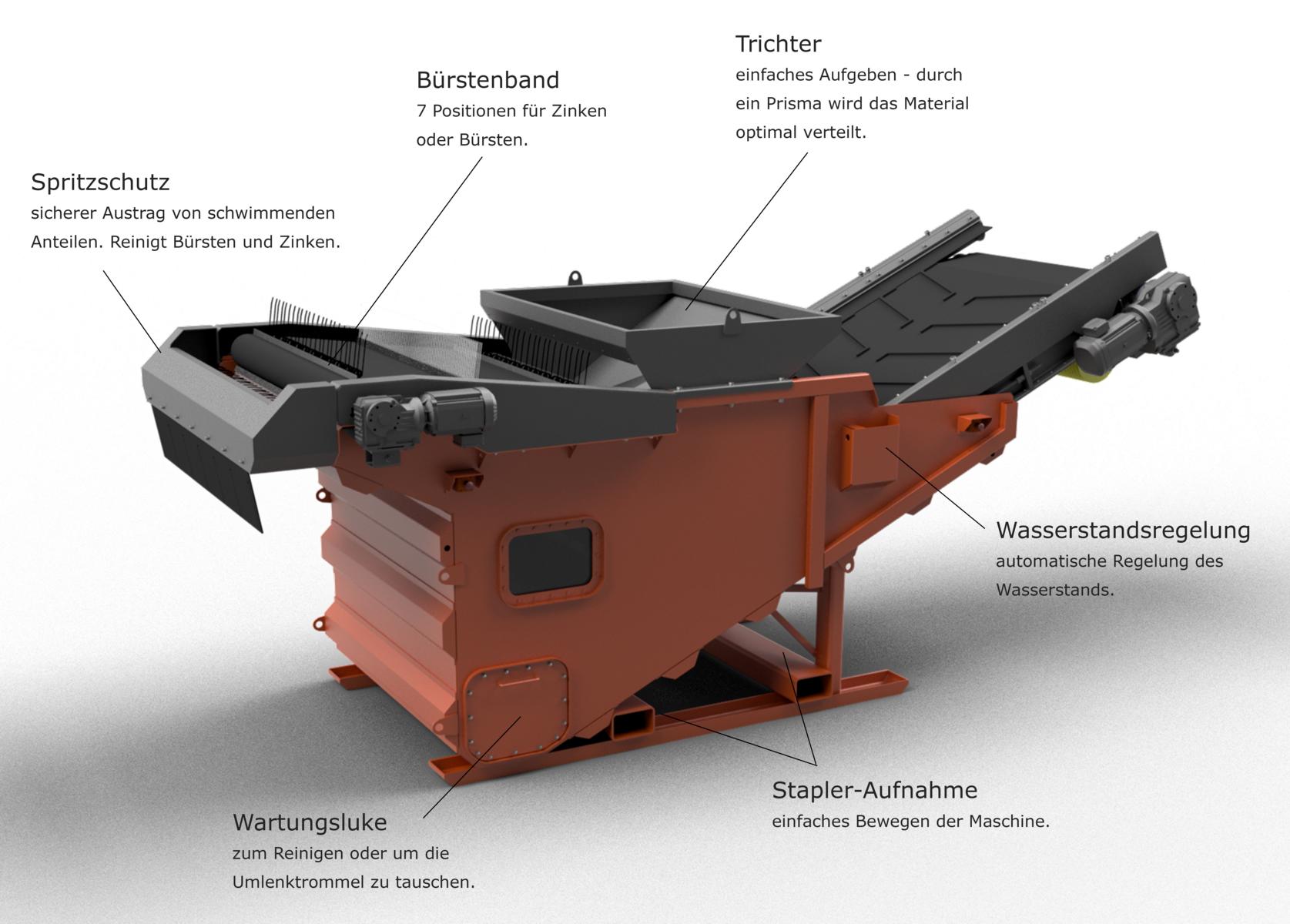 Leichte Stoffe wie Kunststoffe, Folien und Holz treiben an der Oberfläche und werden durch Bürsten und Zinken seitlich abgetragen. Die Schwerstoffe sinken auf das breite Förderband am Boden und werden gegenüber zum Beispiel direkt in einen Container gefördert.
